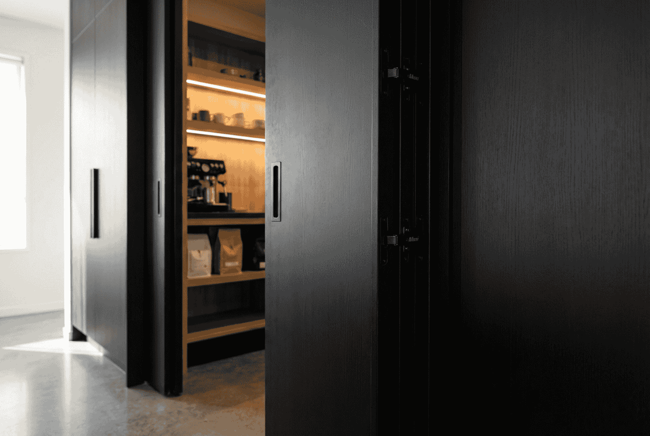 Our team custom-designed a “Hidden Butler’s Pantry” concealed behind pivot-slide pocket doors. This allows the main kitchen bench to remain clutter-free while the toaster, coffee machine, and prep areas are easily accessible yet instantly hideable. All panels were CNC-machined in our Melbourne workshop to ensure millimetre-perfect reveals.